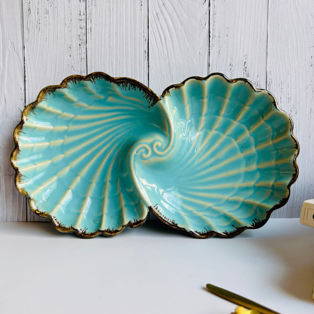 Serve in style with our Twin Shell Platter – a beautifully designed ceramic tray with two compartments, perfect for serving chips and dip, nuts and dry fruits, or mithai and namkeen.