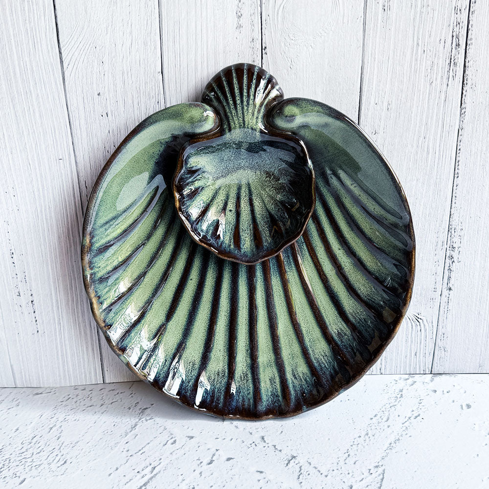 Add an element of sophistication to your table with the Artisan Shell Chip & Dip Platter. This beautifully designed platter, in a rich bottle green hue, features a shell-inspired shape that is perfect for serving your favorite chips and dips in style.