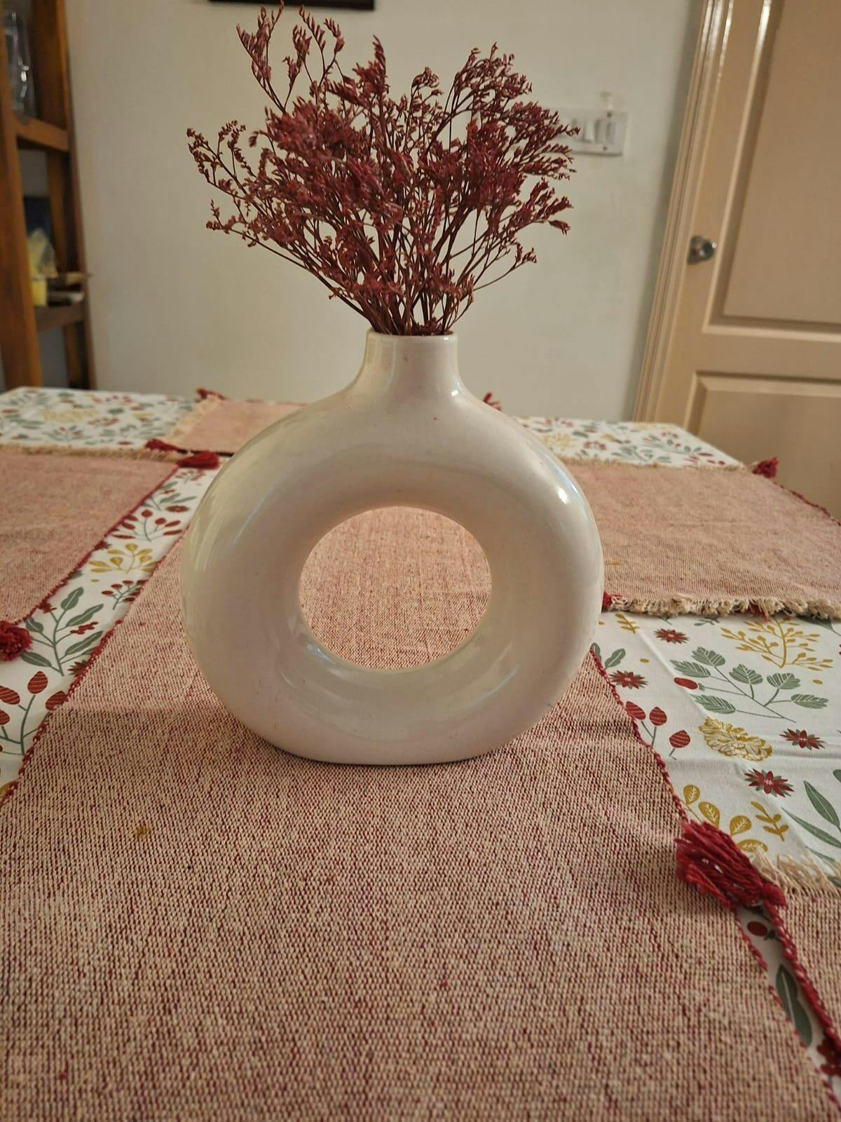 A modern classic with a bold twist, the Crimson Donut Vase is designed to make a statement in any space. Its sleek circular form and deep bright maroon glaze exude elegance, while the hollow center adds a sculptural edge that draws the eye.