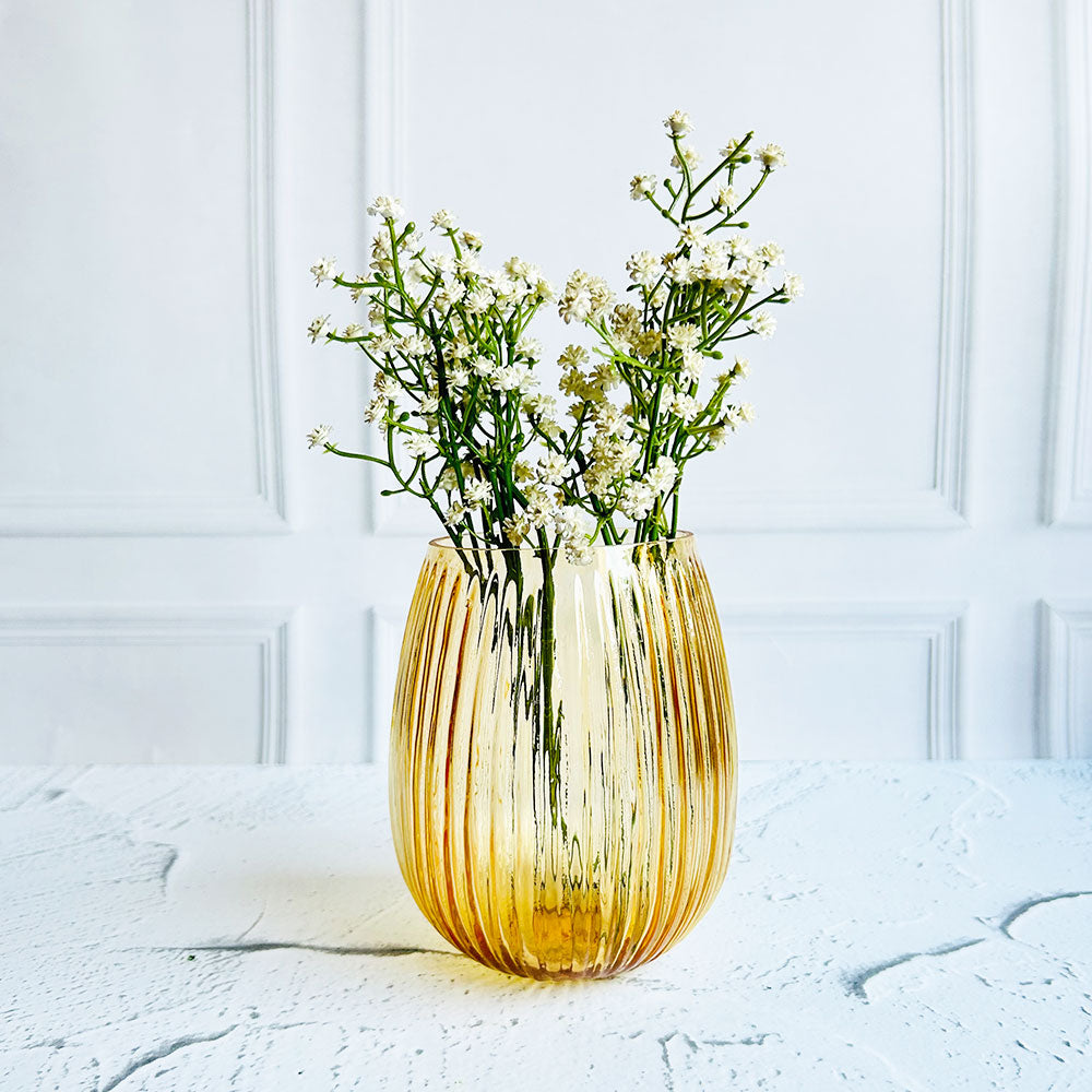 Bring timeless elegance to your home with The Crystal Haven Collection. Crafted from fluted glass in a warm amber shade, these vases add luxury and sophistication, making them the perfect centerpiece for any space.