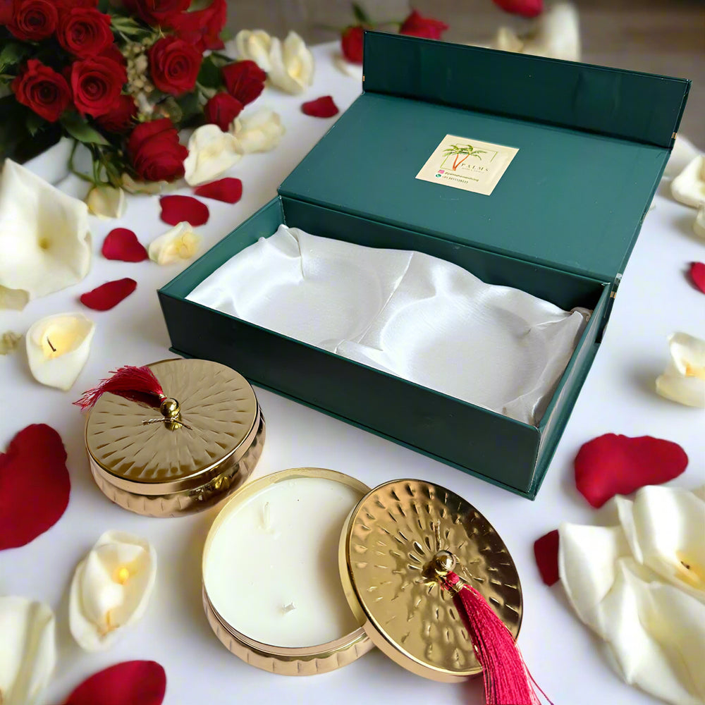 A luxurious candle set designed for thoughtful gifting. The Gold Aura Duo features two elegant metal urli candles, infused with warm notes of vanilla and Oudh. Presented in a beautifully gold-embossed box, this set adds charm to every occasion.
