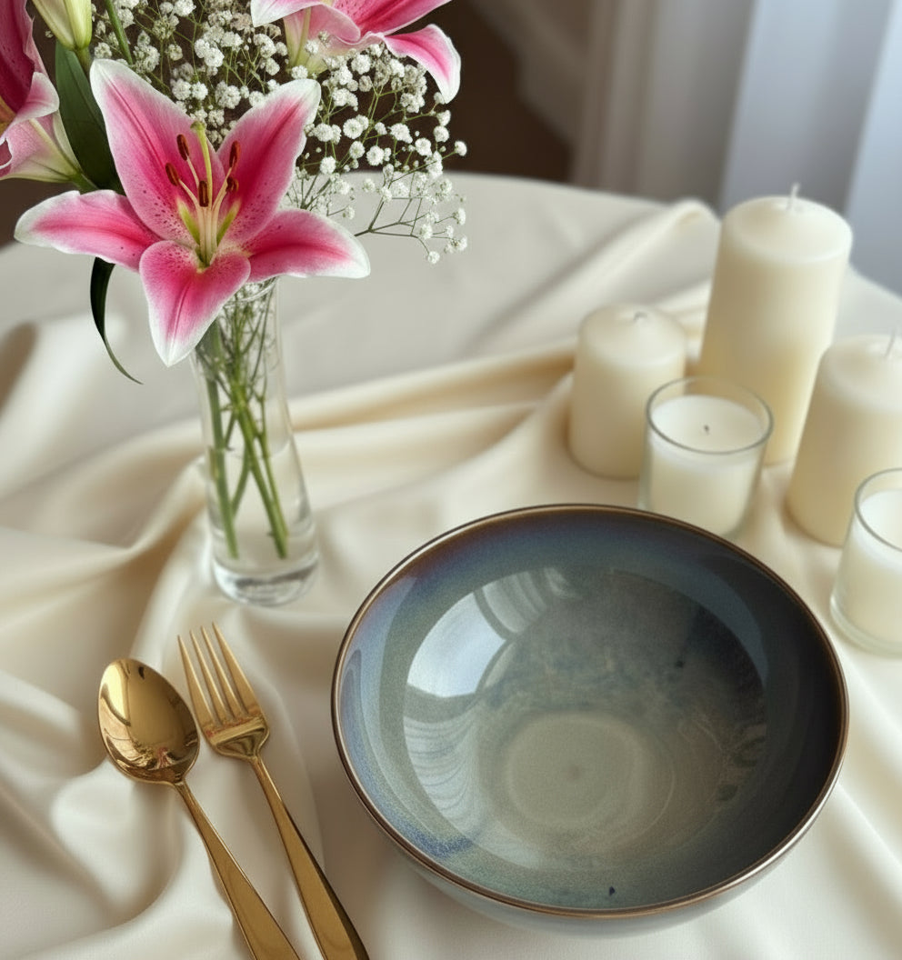 A timeless piece for modern dining. The Twilight Basin features a serene gradient glaze in soft earthy tones, highlighted by a lustrous gold rim that adds understated opulence to every table setting.