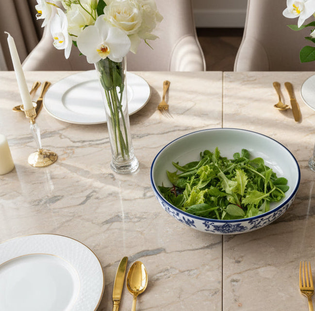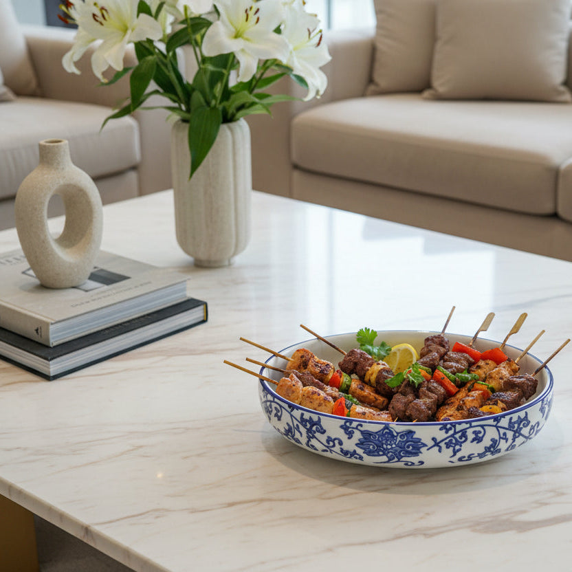 This blue floral deep dish is made from high-quality ceramic and finished with a classic blue-on-white floral design. Its deep sides allow for comfortable serving of gravies, noodles, rice dishes, and salads. Durable, elegant, and versatile, it is perfect for both everyday use and entertaining.