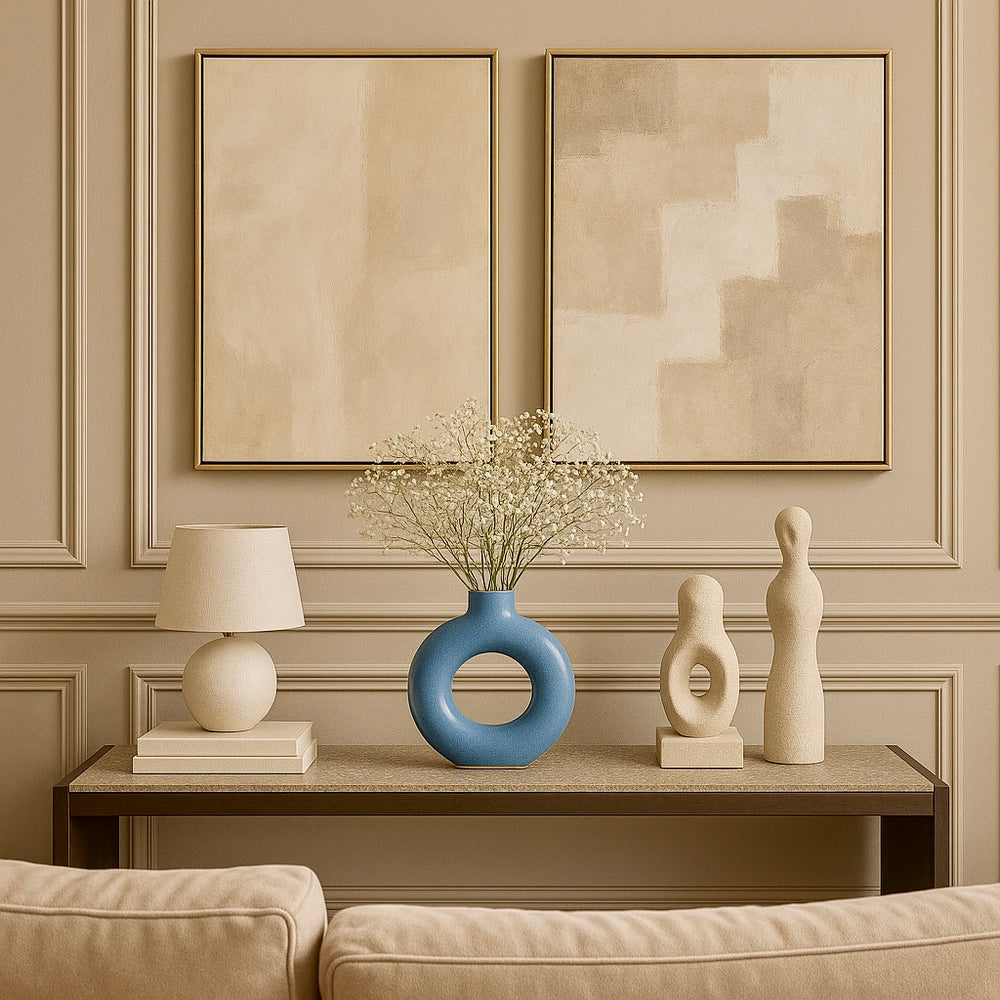 A modern classic with a bold twist, the Azure Donut Vase is designed to make a statement in any space. Its sleek circular form and deep bright blue glaze exude elegance, while the hollow center adds a sculptural edge that draws the eye.