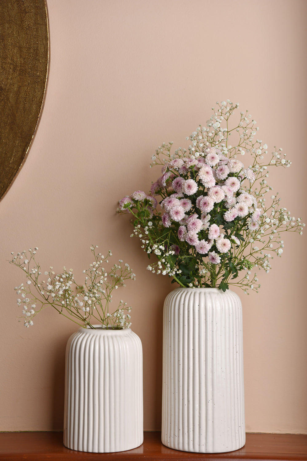 On of our bestselling product, this set of 2 & set of 3 white ribbed vases are ideal for a dried flower arrangement. Put some faux baby’s breath stems and a bunch of pink or purple florals to make the piece stand out.